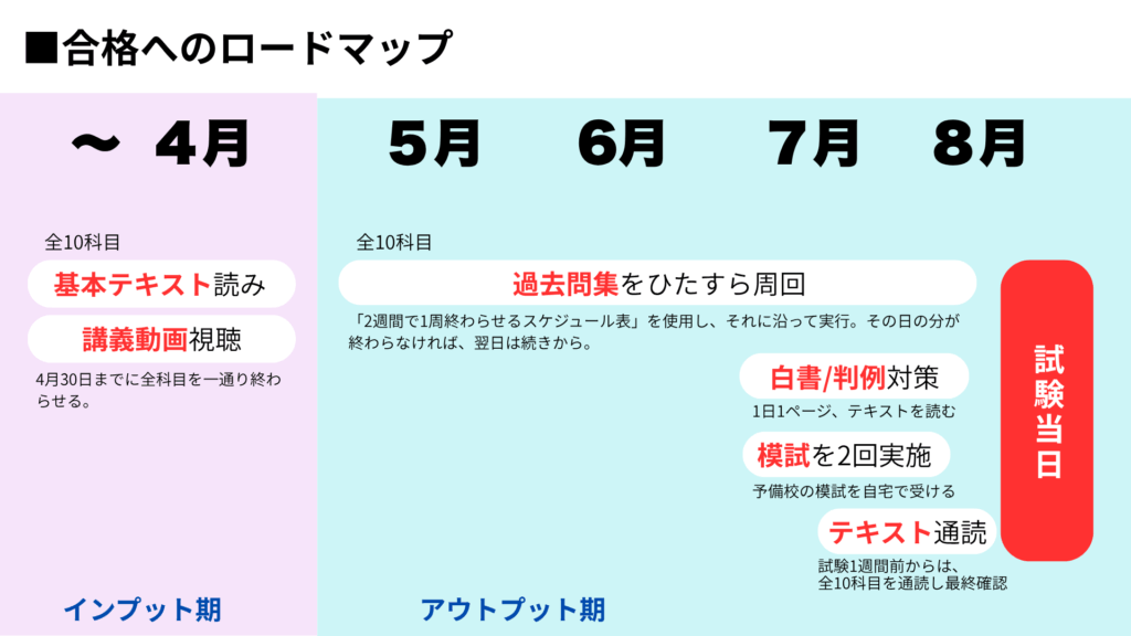 ①受験する年の4月末までに全10科目のインプットを一通り終わらせる。