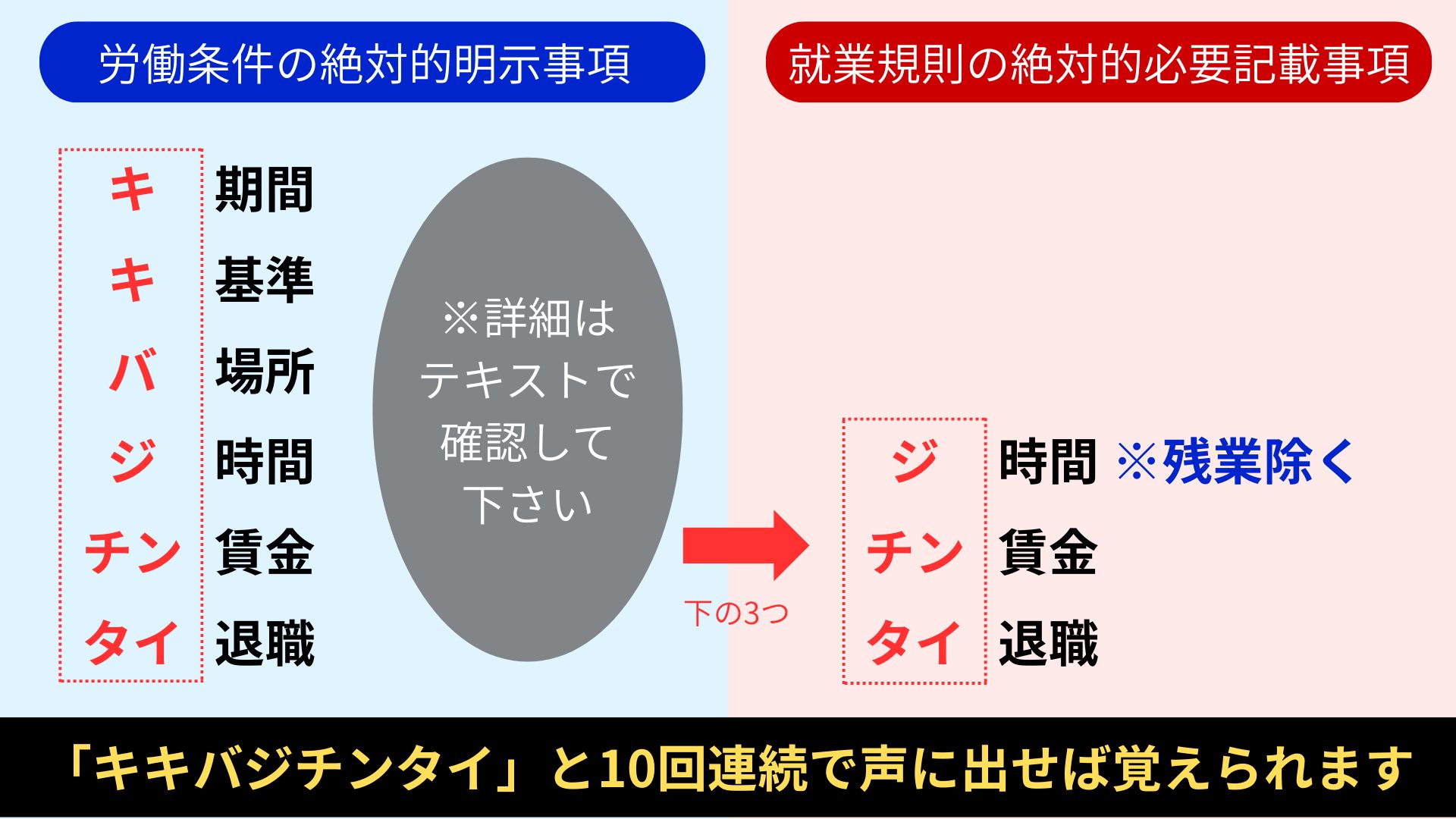 覚え方は同じく「ジ・チン・タイ」です。これは上記を覚えていれば簡単に出てきます。1つ、注意事項としてこちらの「時間」には「所定労働時間を超える労働の有無」は含まれないということです。わかりやすく「残業は除く」と覚えてください。就業規則には「残業ありますよー」とか書かなくて良いということです。