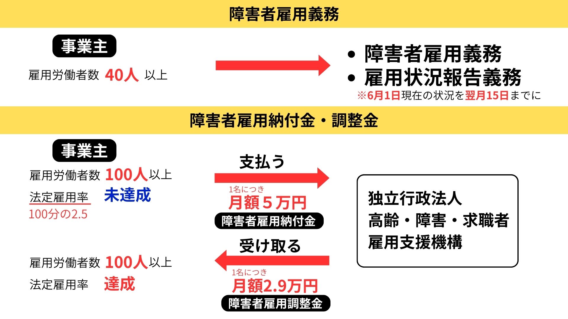 障害者雇用促進法において、障害者の法定雇用率未達成の事業主に該当した場合、障害者雇用納付金として、独立行政法人高齢・障害・求職者雇用支援機構に不足数1人につき月額5万円を納める義務を負う。