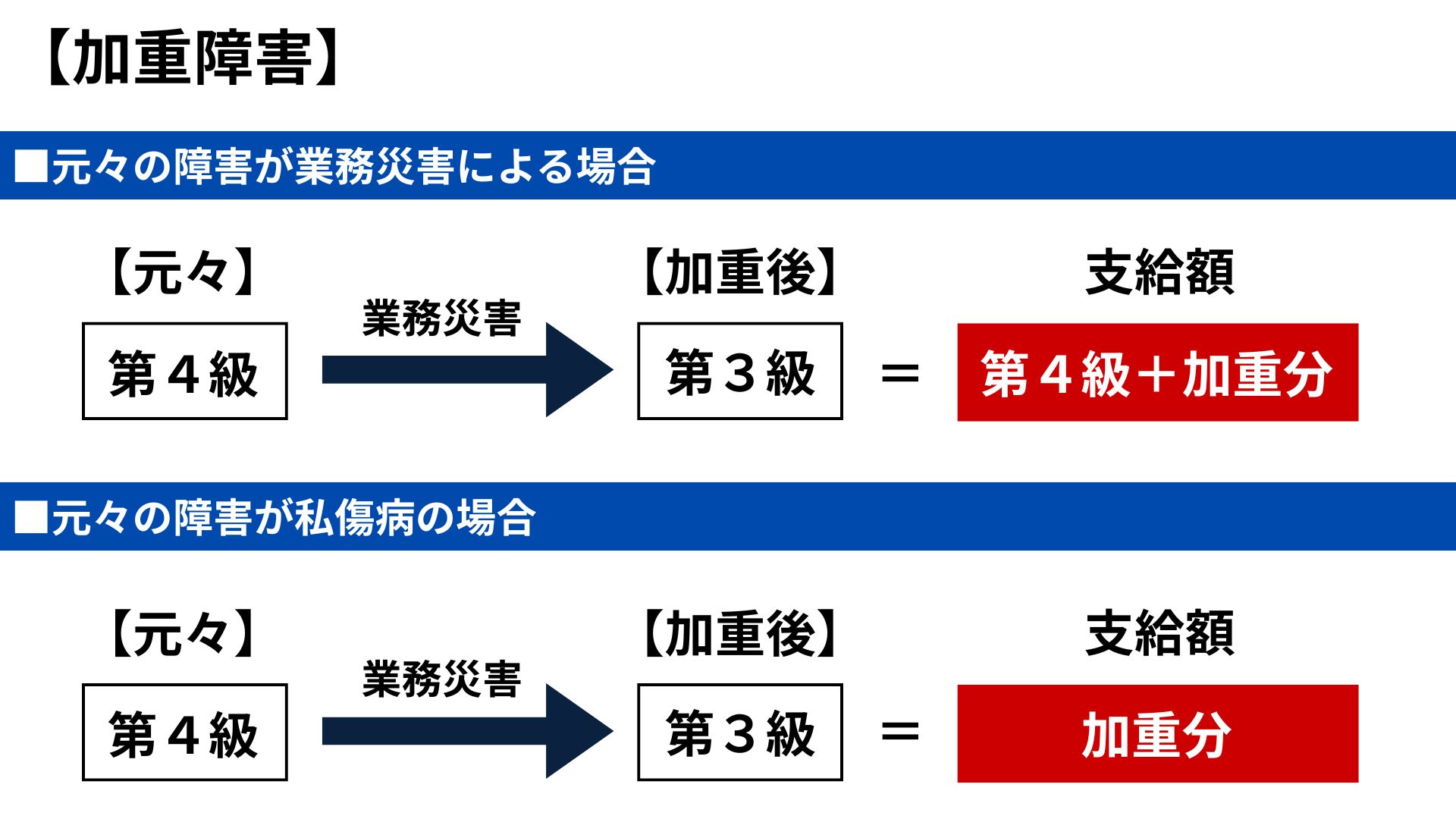 まず加重障害とは、既に障害のあった者が、新たな業務災害等で同一部位について障害の程度を加重した場合に、その悪化した分を差額支給するというものです。もちろん、元々の障害も業務災害等によるものである場合には、元々もらっていた分も引き続きもらえます。