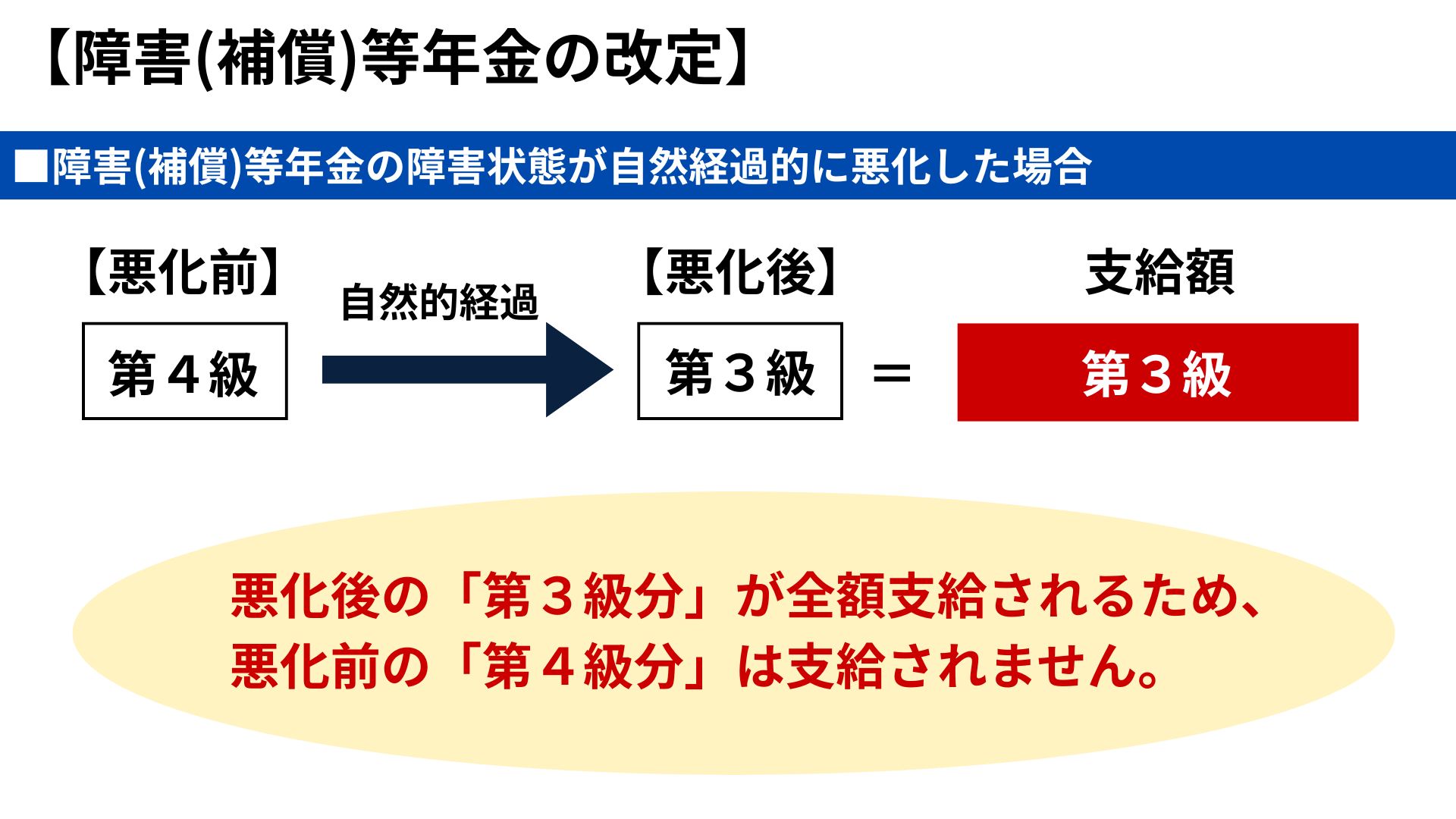 一方、障害(補償)等年金を受ける者が加齢などの自然的経過により悪化し、新たな障害等級に該当するに至った場合は、年金の改定が行われます。改定されるのはあくまで障害(補償)等年金であり、障害(補償)等一時金を受けた者は、既に補償が完結しているため改定の対象とはなりません。