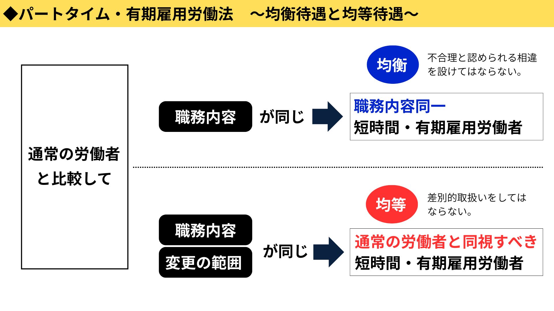 まとめると、「職務内容」だけが同じならあくまで均衡のとれた待遇が求められ、「職務内容」+「変更の範囲」まで同じなら均等の待遇でなければいけません。