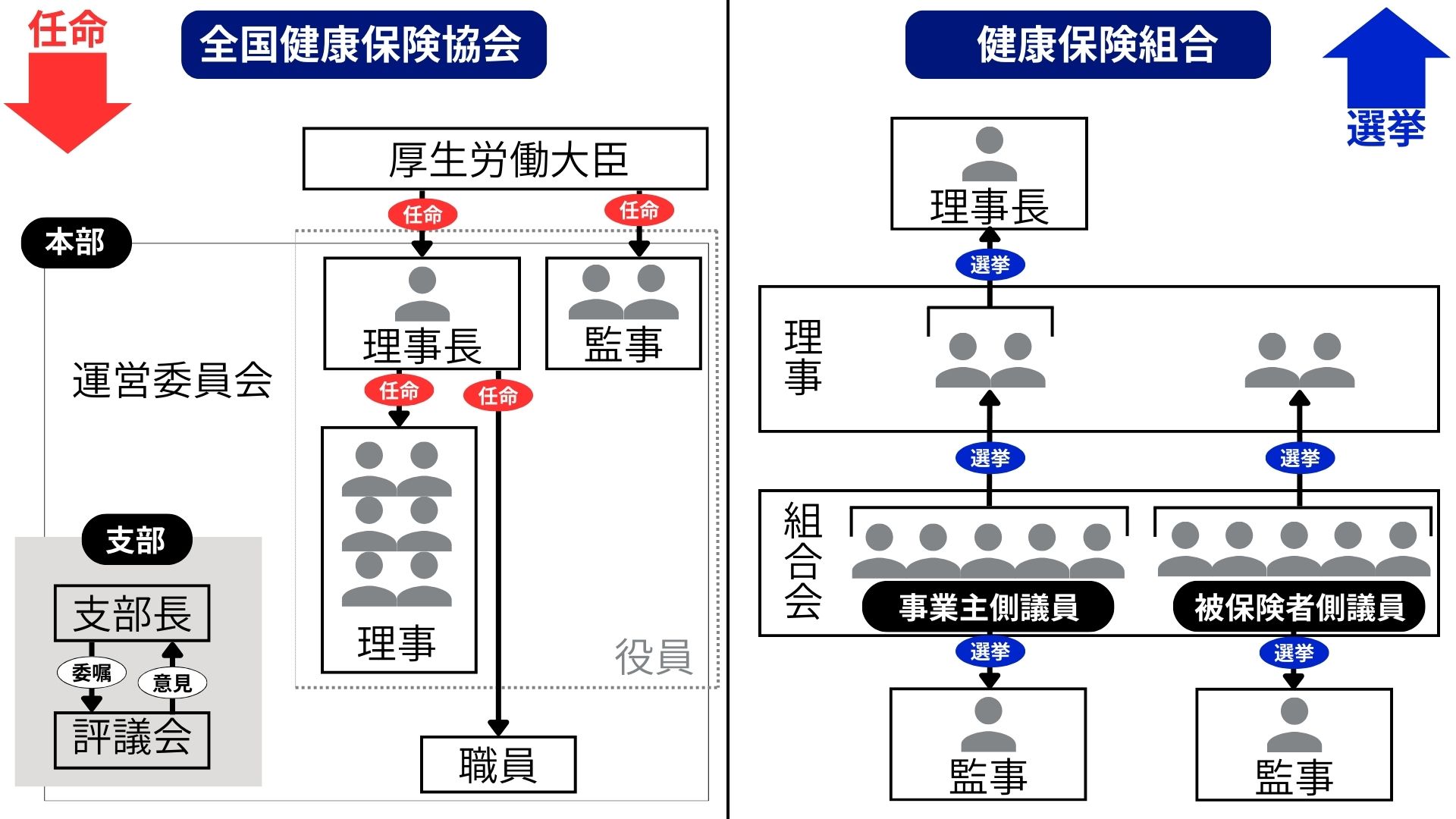 健康保険組合と全国健康保険協会(協会けんぽ)の組織構成は、かなり出題頻度が高い論点です。