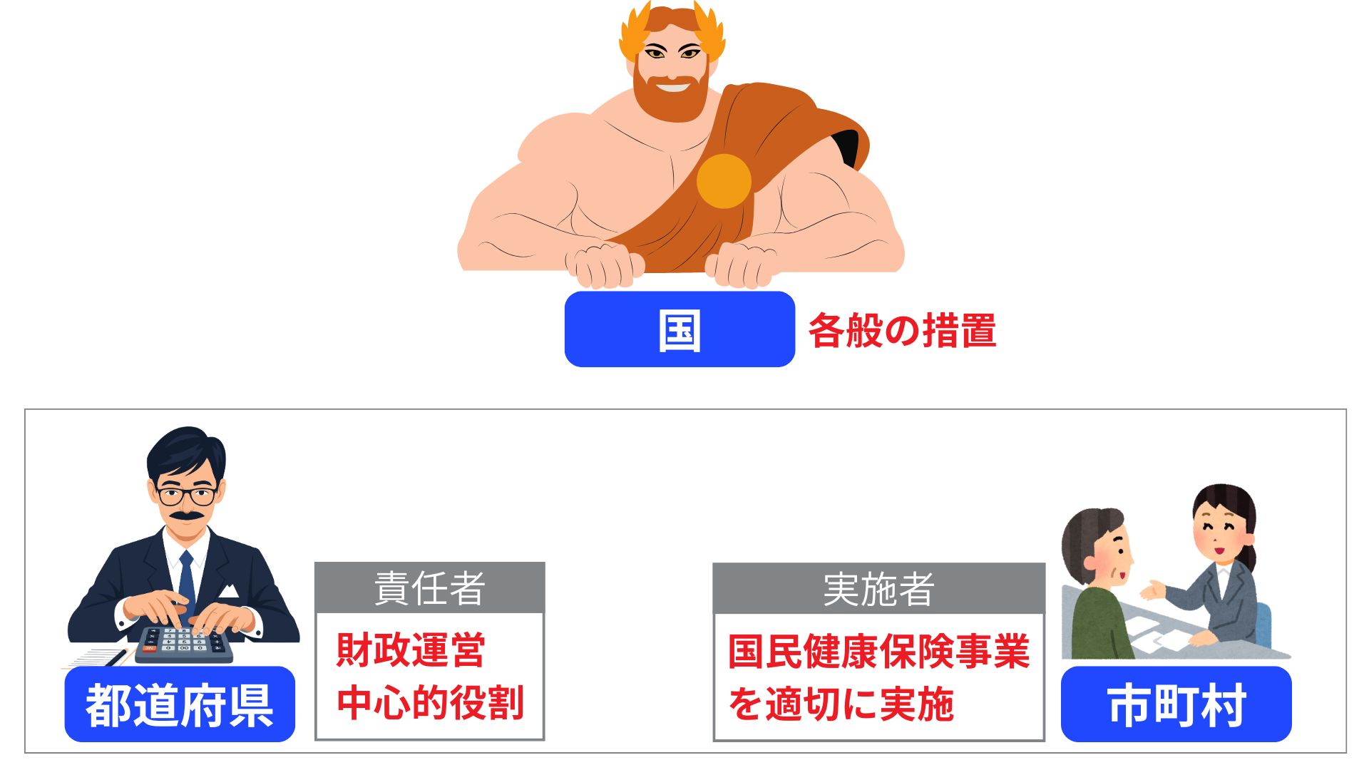 都道府県等による国民健康保険における国・都道府県・市町村の役割をスッキリ整理していきましょう。