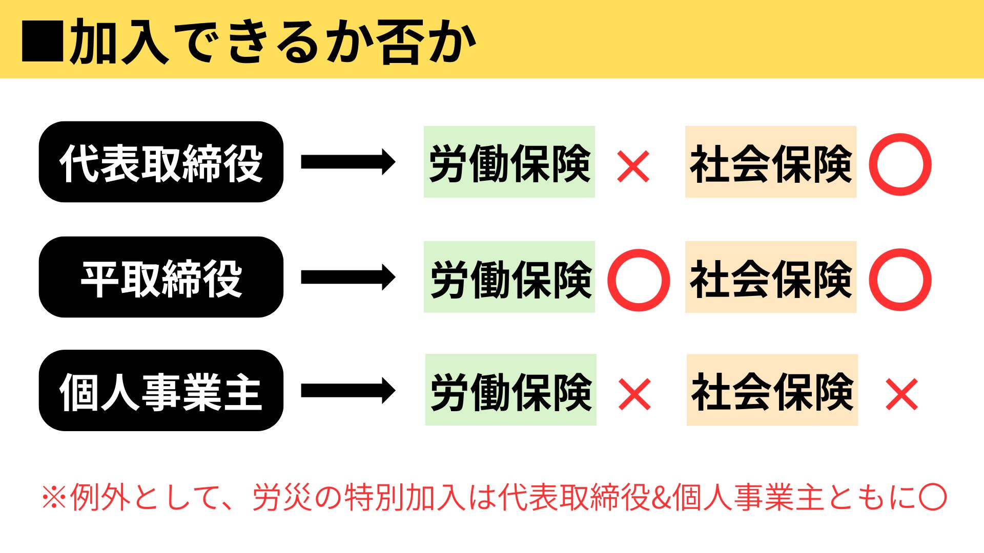 - 代表取締役は、労働保険には全て加入できず、社会保険では被保険者となります。(例外:労災の特別加入)