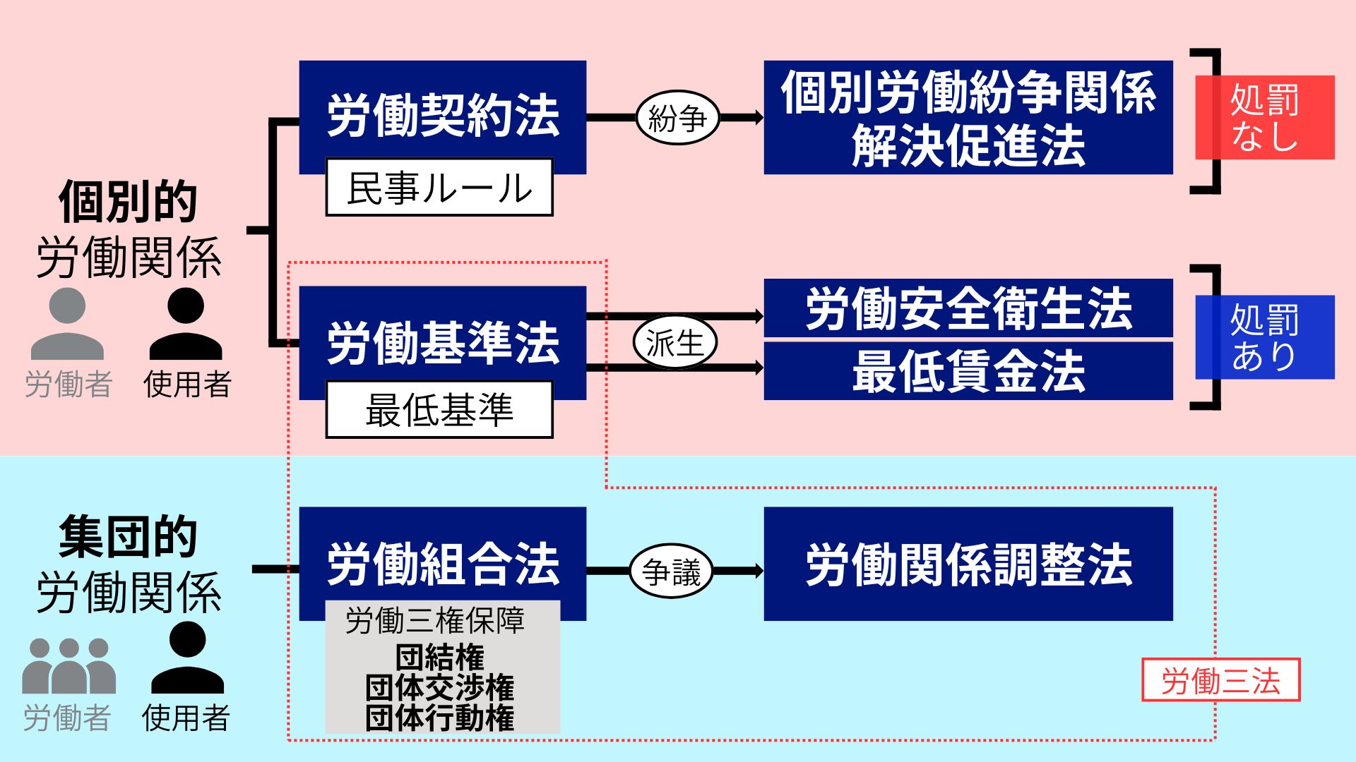 基本的には「契約」というものは双方の合意のもとで自由に行われるべきものです。そこには国家権力は介入しません。民事不介入というやつです。「労働基準法」が労働条件の最低基準を定めて労働者を保護し、違反に対する罰則を設けて違反を厳格に抑止しているのに対し、「労働契約法」はあくまで労使間のルールを定めたものであり、罰則もないため、仮に使用者が違反しても労働者は裁判を起こして霜害賠償請求するなど、自分の身は自分で守る必要があるのです。