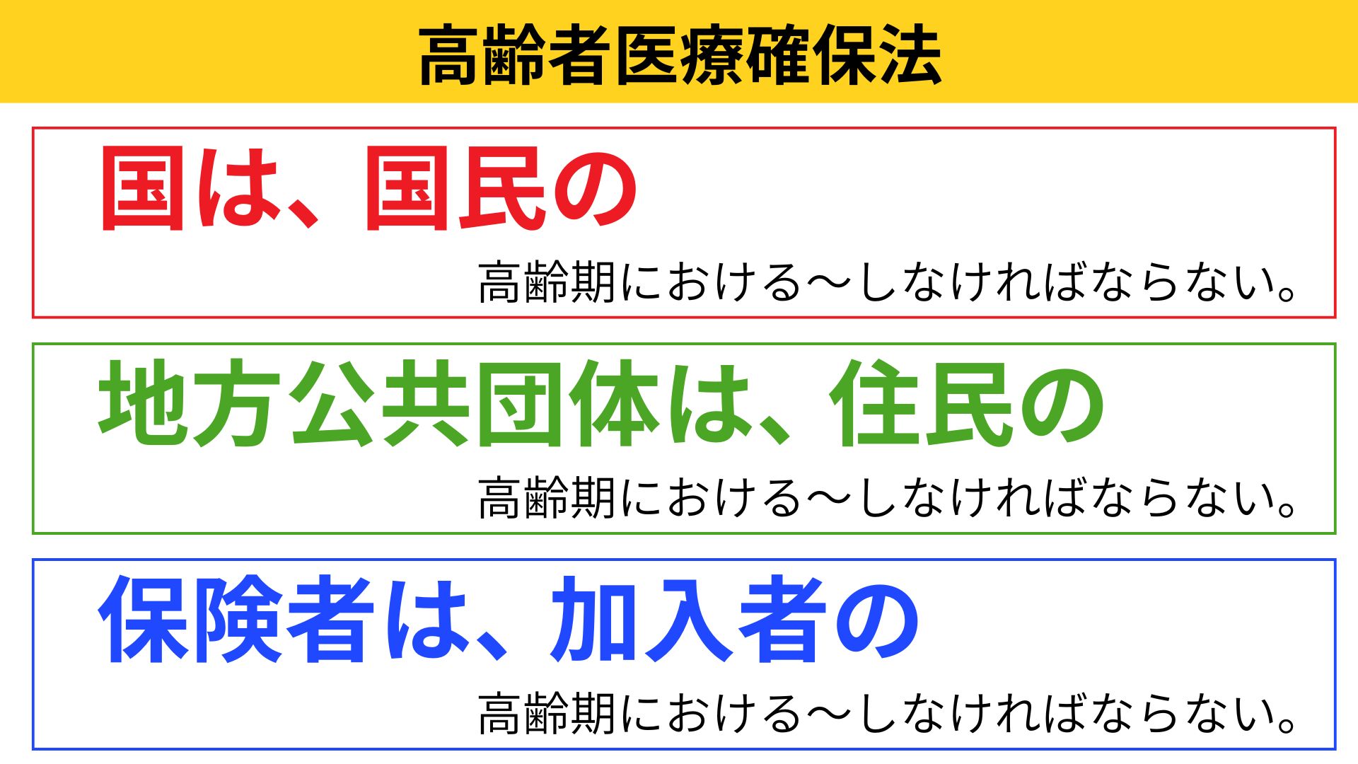 国は、この法律の趣旨を尊重し、住民の高齢期における医療に要する費用の適正化を図るための取組及び高齢者医療制度の運営が適切かつ円滑に行われるよう所要の施策を実施しなければならない。
