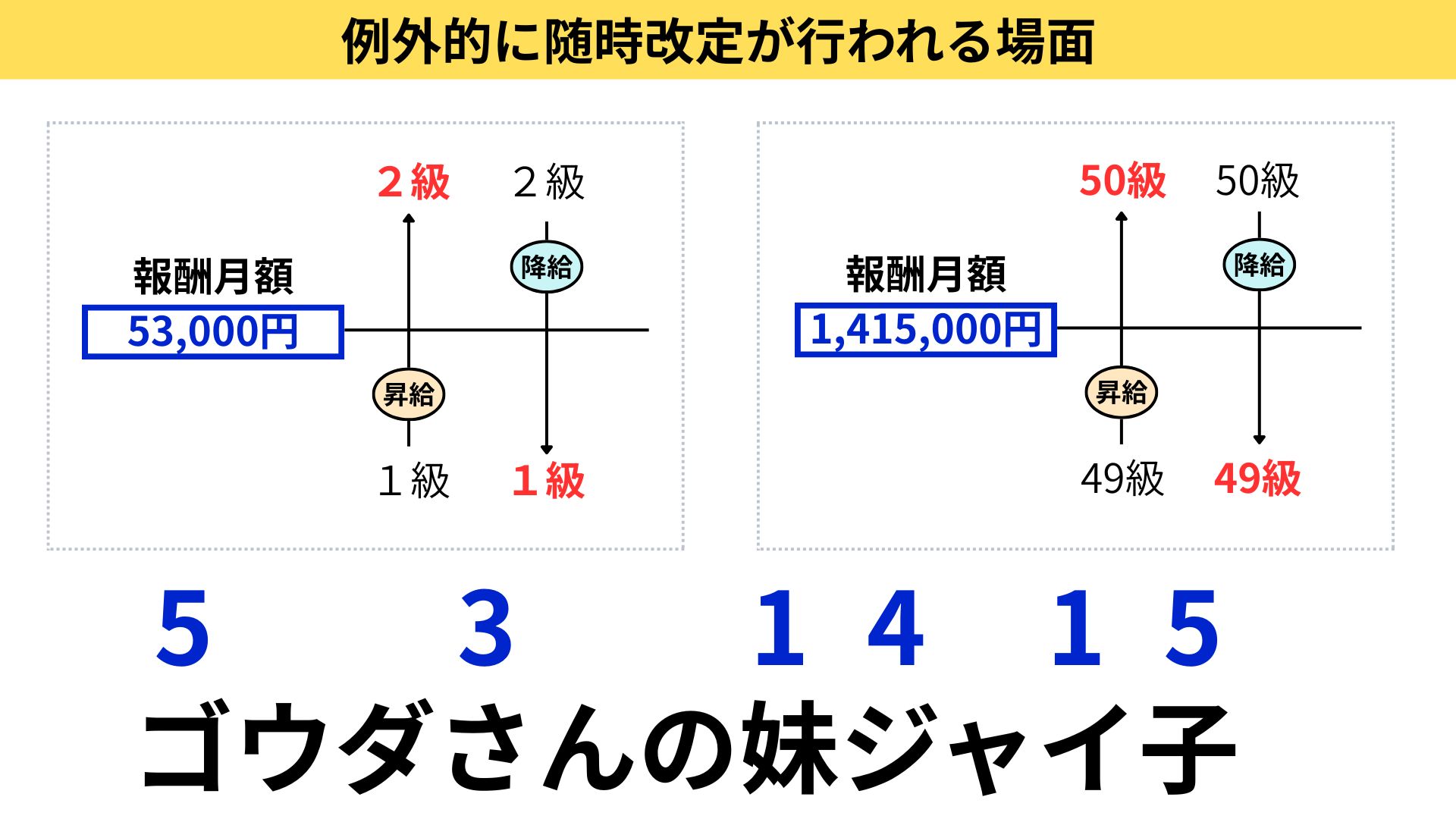標準報酬月額が第49等級(報酬月額1,295,000円以上1,355,000円未満)である者が、昇給により第50等級で報酬月額1,415,000円以上に該当した場合、実質2等級の変動と考え随時改定の対象となる。