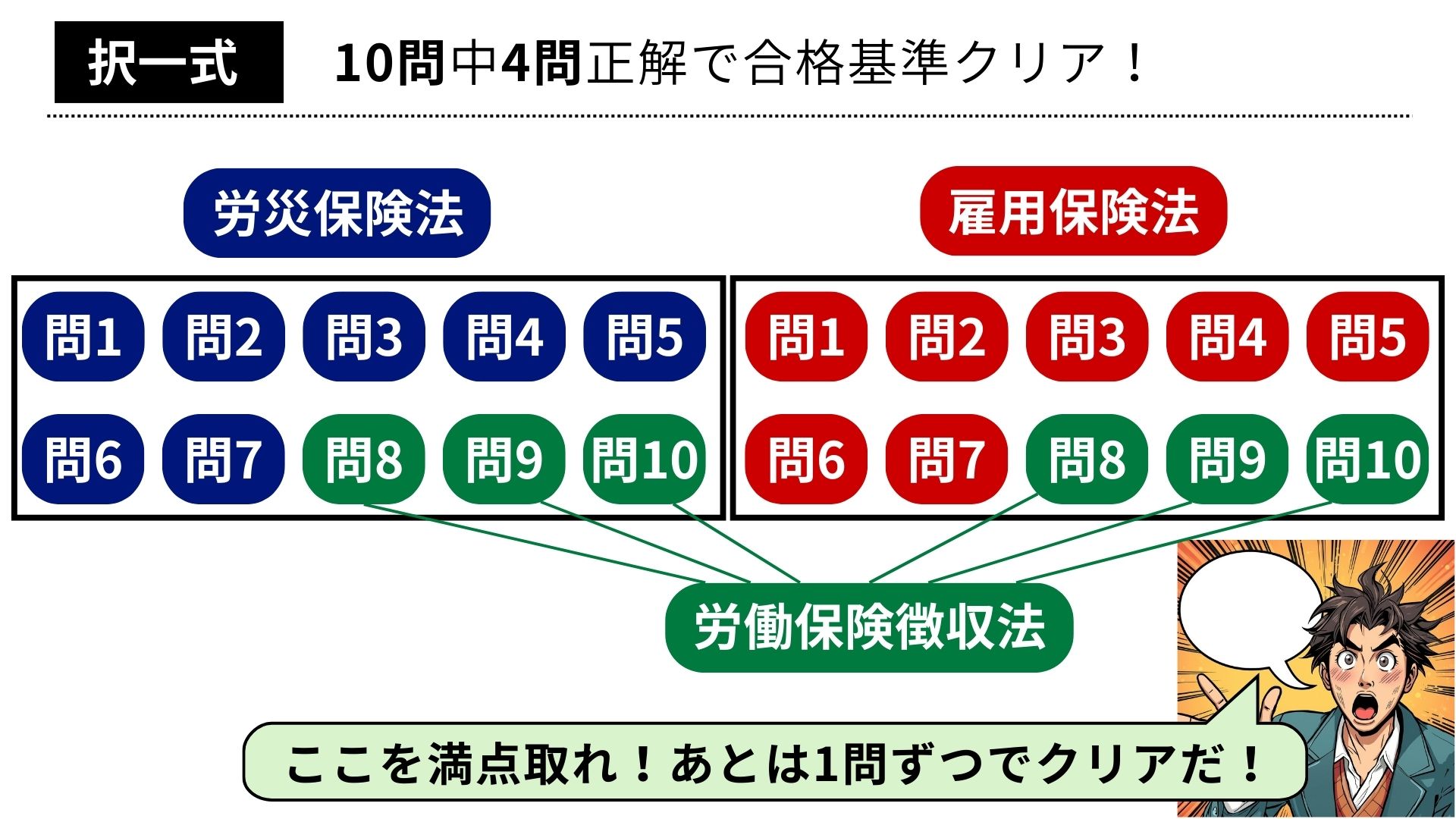 そして、この科目をマスターすることによる最大の利点が、択一において得点が伸び悩むことが多い「労災保険」と「雇用保険」のうち、それぞれ10問中3問がこの「労働保険徴収法」だということです。それは逆に言えば、その3問が確実に得点できたなら、「労災保険」も「雇用保険」も、残り7問中あと1問正解すれば、合格基準点をクリアできるということです。7問中1問で良いんですよ!全部適当でも確率的には1~2問は当たります(笑)