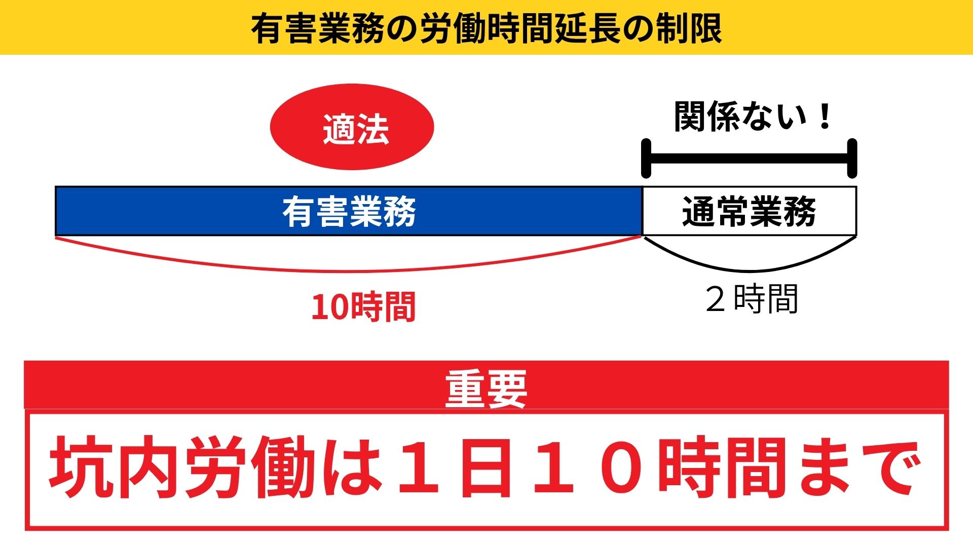 「坑内労働などの有害業務は、【法定時間(8時間)+2時間】が制限である」